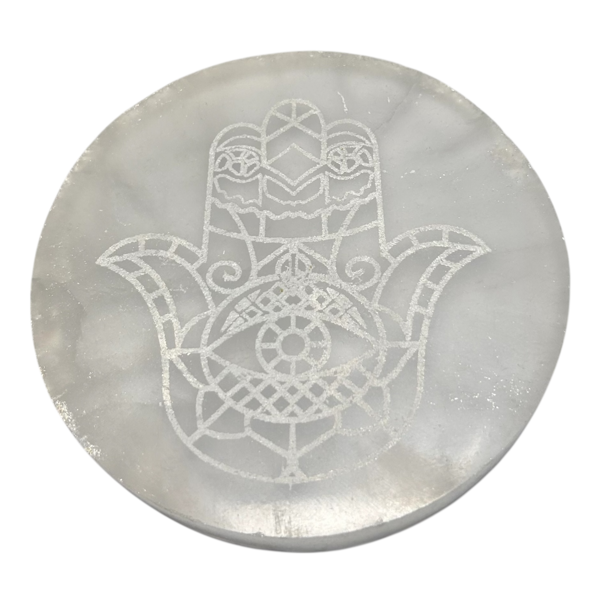 - Conteúdo: 1 placa redonda de selenita com símbolo Hamsá.